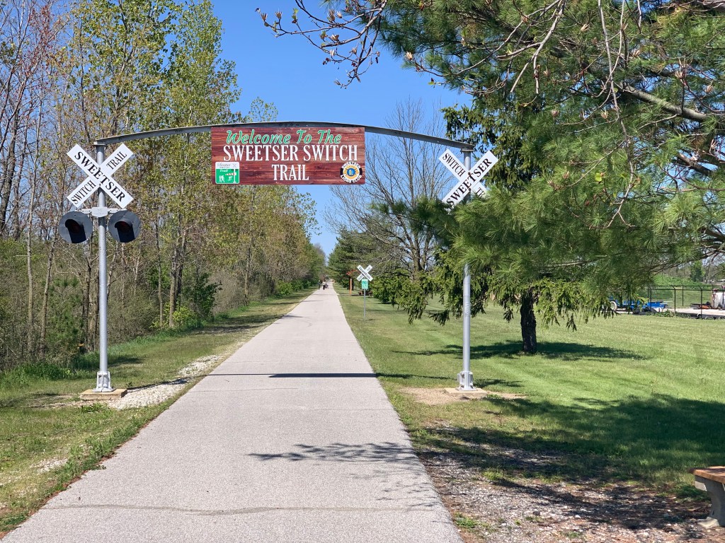 Today started out so great. It’s the first really nice day I’ve had in weeks, sunny, light wind, almost 70, I could wear my shorts and sandals. Today I was treated to not one but four different bike paths: the final segment of my beloved Cardinal Greenway; the Sweetser Switch Trail, with more elaborate signage;