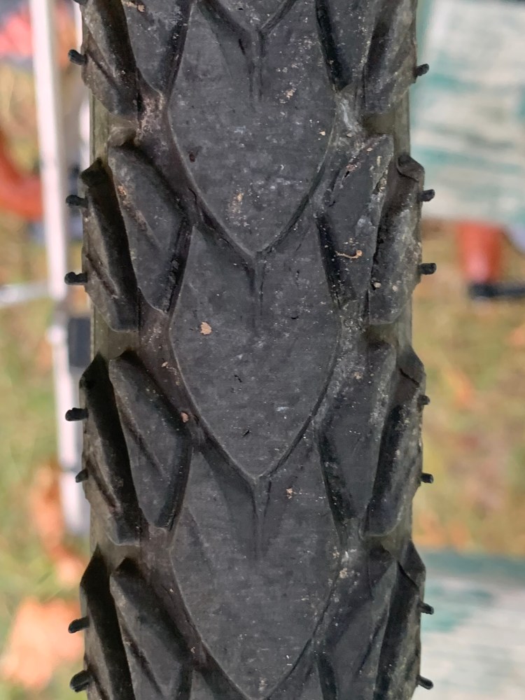 So now, after 3,000 miles, it makes sense to rotate them. This is much easier with a floor-style tire pump. There were no bike shops in town but one of those outdoor bike repair stands had one. Great!