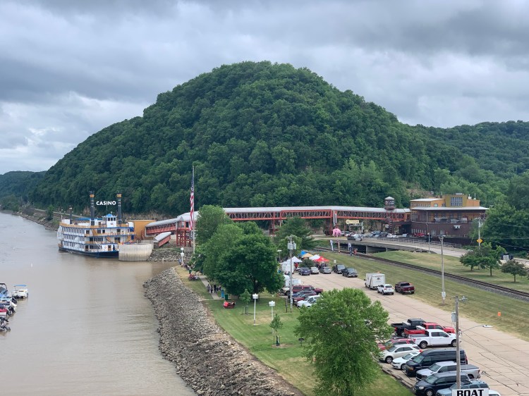 I’ve toyed with climbing the Colorado Pikes Peak, but the road is closed to bicycles and the trail is 13 miles one way. This one seemed easier, just 500 feet above the river. You have to cross a series of bridges to get across the islands and channels of the Mississippi, and you get this view of the Peak, actually a shoulder of it called Point Ann, above a riverboat casino.