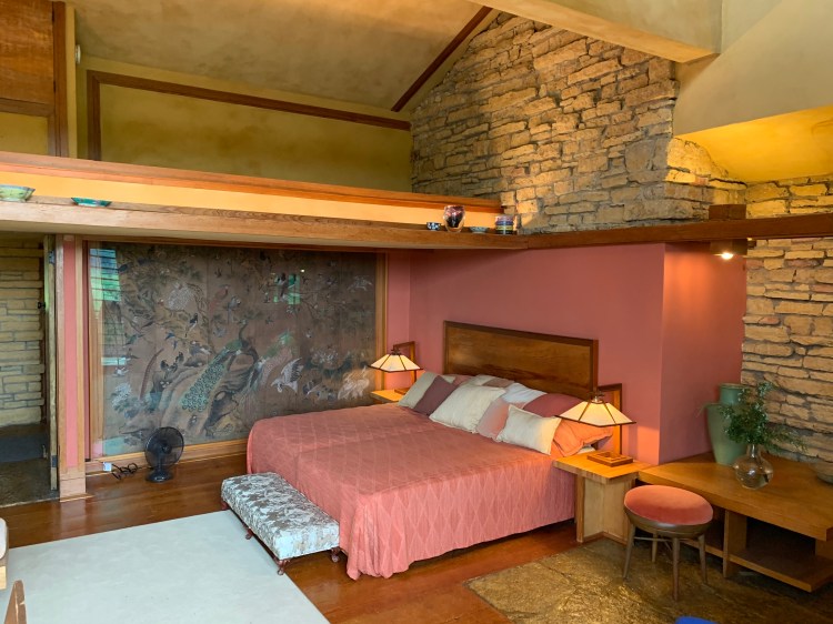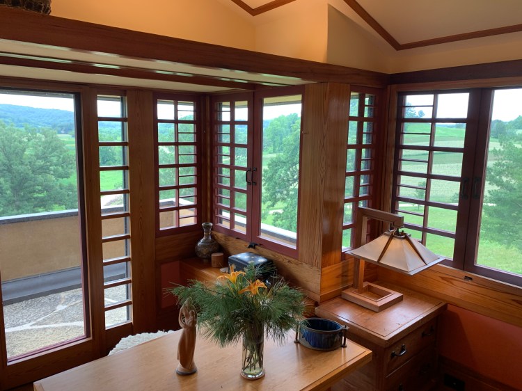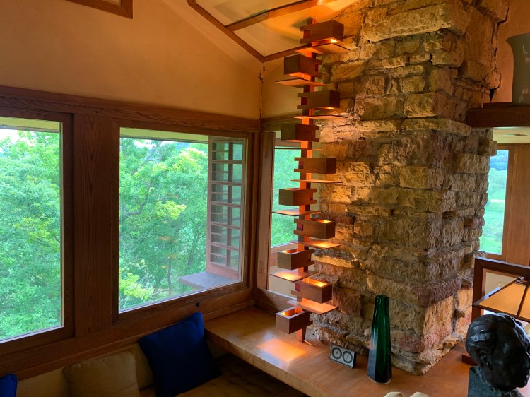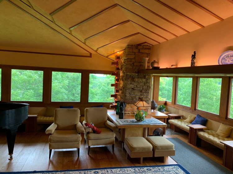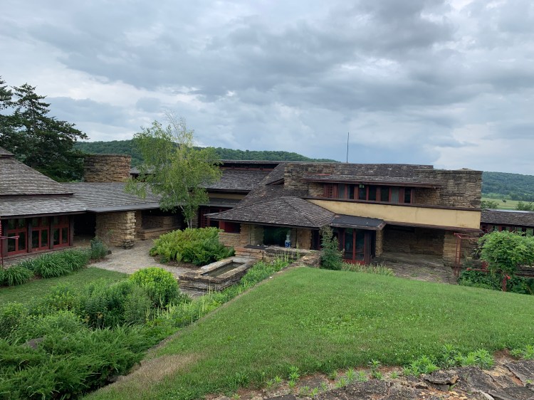 That marriage of bike touring and stunning architecture in harmony with the land, made Taliesin an alluring destination. This was his home, and a “lab” for many of his designs. It’s a Welsh word meaning “shining brow,” reflecting Wright’s welsh roots and his vision to integrate his structures with the contour of the terrain. Never build a house on top of the hill, that would ruin the line. Instead, tuck it in just below the brow, make it part of the landscape. Brilliant.