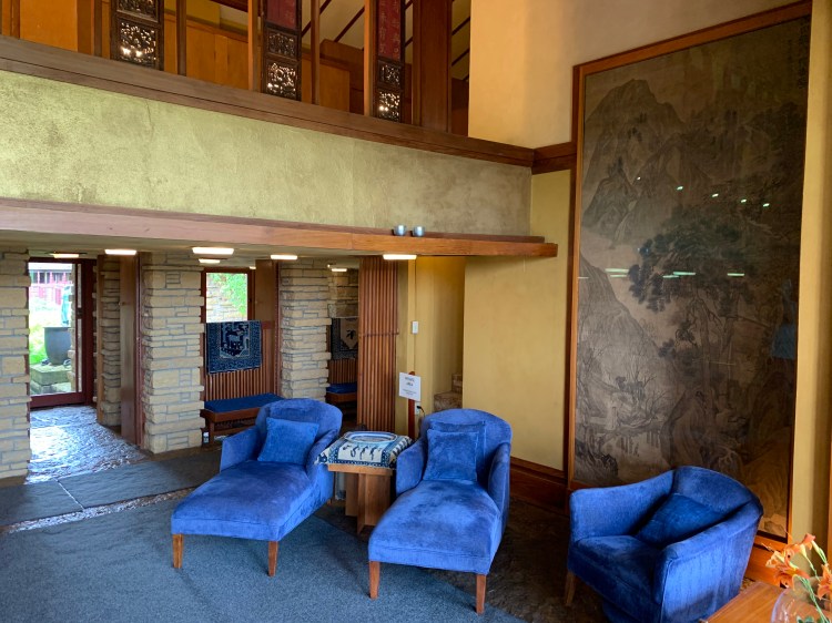 He never went to architecture school. He barely finished high school, and blew off the University of Wisconsin after a semester. He did apprentice under Sillsbee and Sullivan, but his virtuosity was entirely his own. A short man with a Napoleanic complex, he always insisted on photographed from below, often with his trademark porkpie hat. Even our guide, clearly mesmerized by the man, admitted he could be “difficult.” That’s putting it mildly. We had to prod him, but he related the sordid tales of his affairs, and the grisly arson/murder that happened here. For all that baggage, though, the man is irresistible.