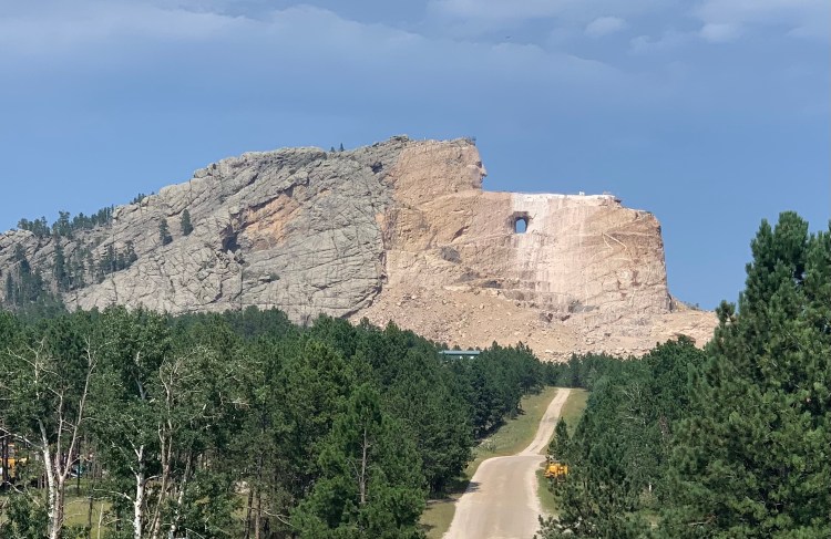 The backside of Mount Rushmore, seen yesterday from the top of Black Elk Peak, was all I cared to see of that monument. I’ve seen it twice before, there are always huge crowds, and as much as I admire those four men, one could argue that two slaveholders, a wealthy adventurer, and the man who was responsible for the largest mass execution in our history, 38 Native Americans in 1862, were out of place here. There was one face in stone I did want to see, Tȟašúŋke Witkó, AKA Crazy Horse. I’d listened to his full story over the past few days in the audiobook The Journey of Crazy Horse, and I wanted to pay tribute to this man who cherished the Black Hills above all else, and who gave his life defending them for his people.