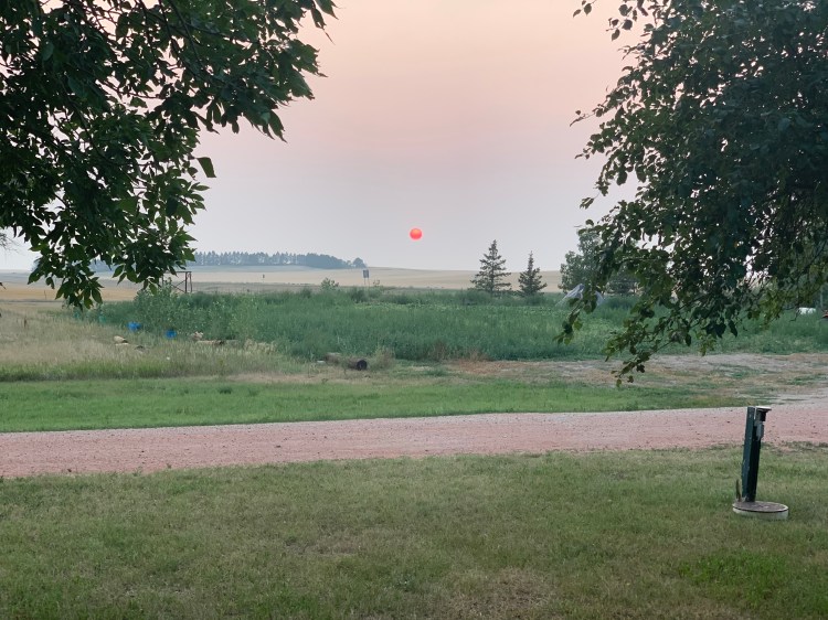 The tiny town of Amidon, closest to the highpoint tomorrow, it looked like it had nothing but there was a campsite with an underground bar, Mo’s Bunker, where I had fun talking to the bartender Jodi, and two bikers, Ralph and Maynard, who told me what to expect at the upcoming Sturgis rally. All they had was fried food, not so healthy but so satisfying. I pitched my tent under the sunset, the smoke from wildfires in Canada made it once again a red rubber ball.