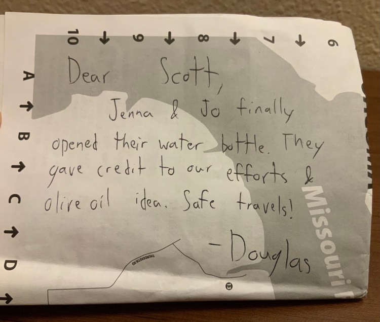 The day started with a humorous coda to the stuck water bottle incident, I came back from the bathroom and my friends had all left, but there was this note.