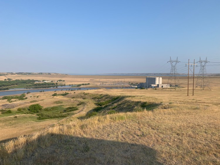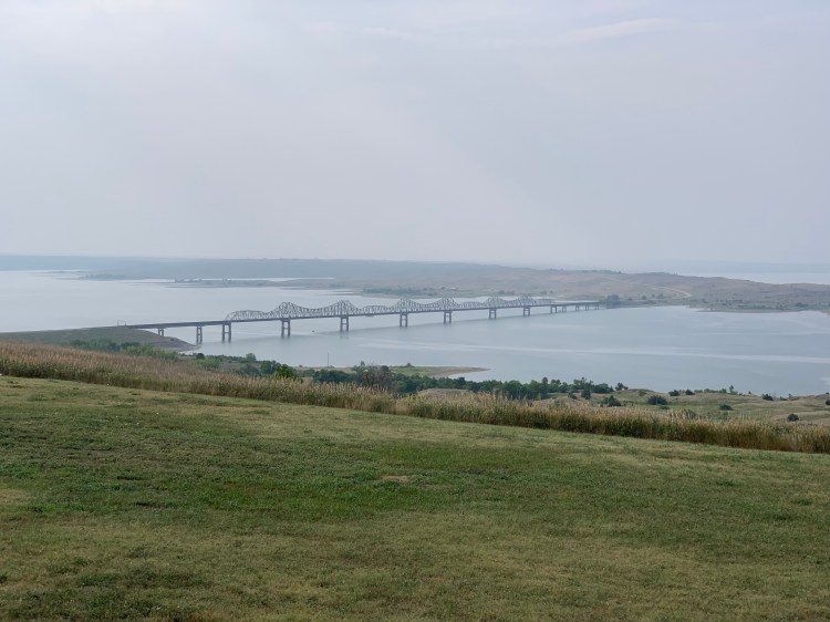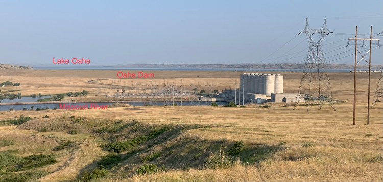 That boring earthen bank is actually the Oahe Dam, with Lake Oahe behind it. The word kind of rhymes with “Hawaii”, interesting because it is almost spelled like Oahu, Hawaii’s most populous island. Anyway Lake Oahe is quite a thing, the fourth largest reservoir in the country, it stretches 231 miles between the two state capitals, Pierre and Bismarck. Its coastline is said to be longer than California’s.