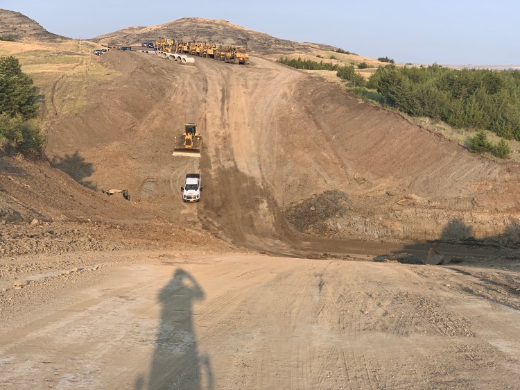 So steep I didn’t dare ride down the soft dirt, I dismounted and inched down clutching both brake levers. A guy in that white pickup rolled by and said “it won’t be fun going up the other side!” He was right. I could push the 100-pound bike ahead only a foot or two, then clamp on the brakes and take a step up, and repeat the process, almost like using a walker. Charming. Took me almost a half hour to cross, and I was pretty grubby at the end. Luckily though, pavement started soon after. I didn’t think to ask what pipeline that was, since they’ve abandoned the Keystone Project.