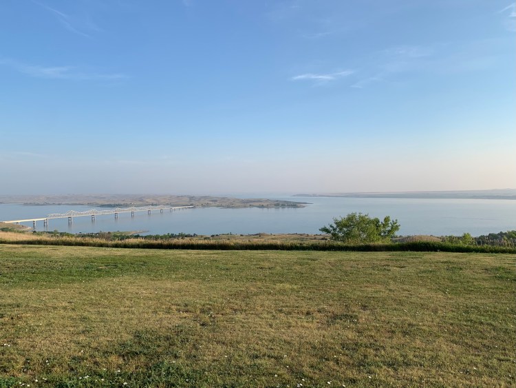 I had wanted to leave before sunrise this morning, but it was raining so I didn’t actually leave until 7:30. The rain had stopped and cleared the haze somewhat, and I got a better picture of Lake Oahe.