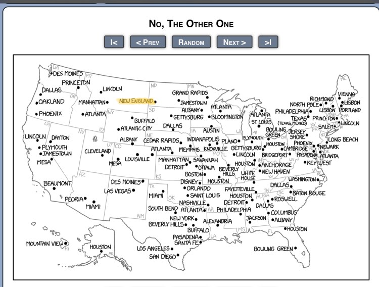 My good buddy Frank sent a link to a great webcomic called xkcd (worth checking out if you’ve never seen it) when he saw where I was headed next. It’s a map of the many US towns named after more famous places.
