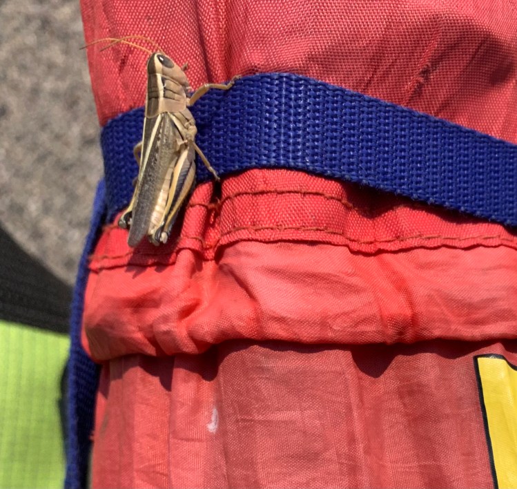 Not a scrap of shade anywhere, had to eat my snacks with the bike propped against a sign and sitting on the grass. There were crickets everywhere, bouncing off me constantly, one determined little fellow hung on for 20 miles despite my hitting 38 mph and being buffeted by crosswinds, I wanted to call him Jimminy.