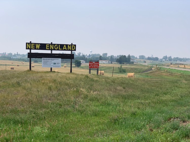 Yup, it’s true, today’s ride took me through New England, North Dakota. Brian, who you remember got me started on this highpoint thing and has also been through here, had scoffed at it thusly: “We drove by a town called “New England” that had a sign proclaiming it Class Whatever State Football Champions in some long ago year. There were half a dozen houses, a couple of closed businesses, and there, at the end of the one main street, was the high school – looked about big enough for four rooms on each of two floors.”