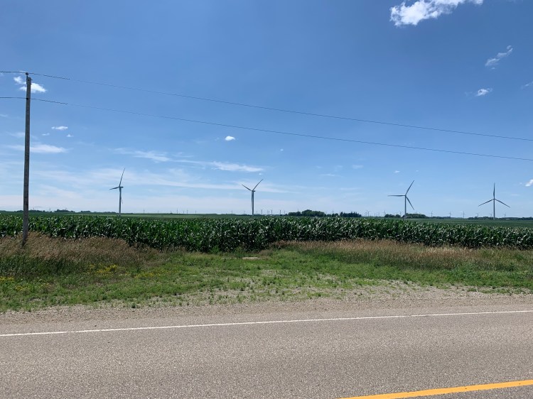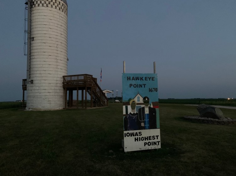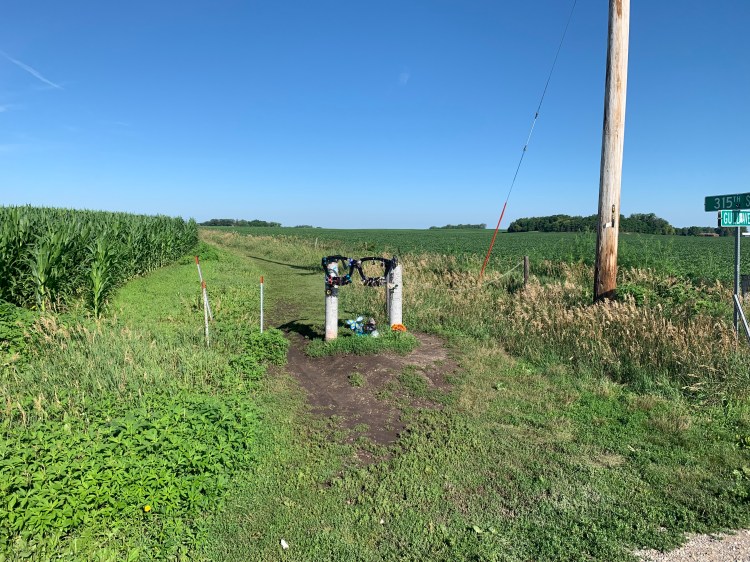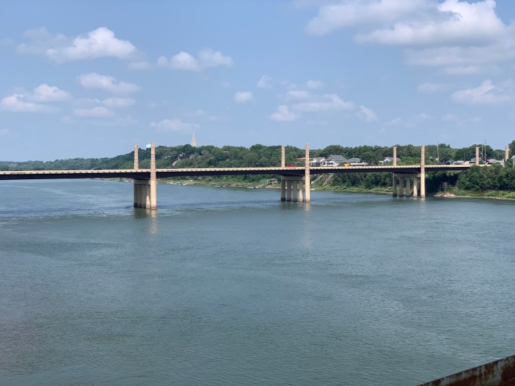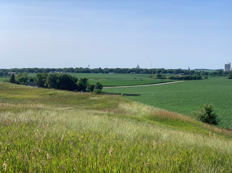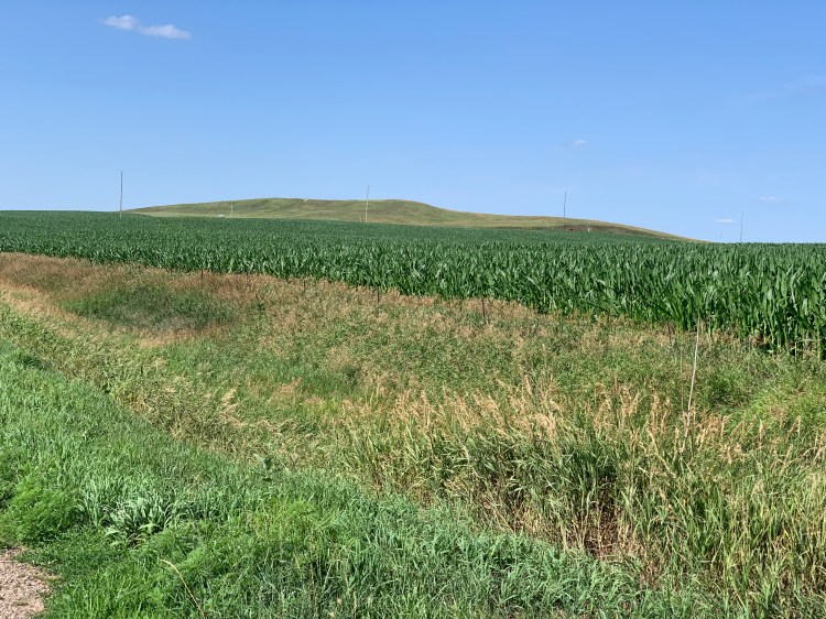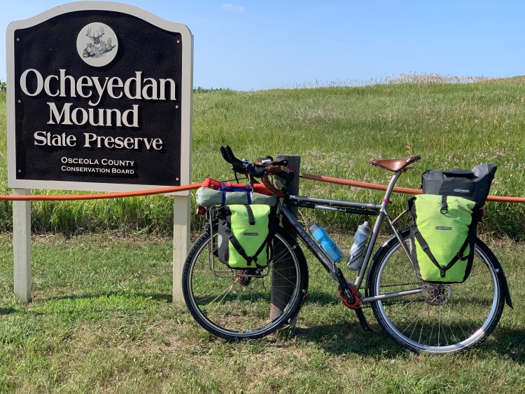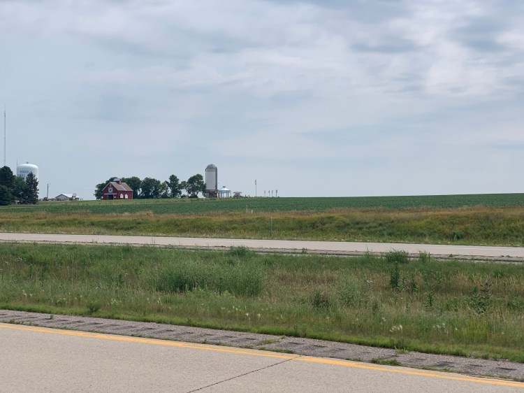The climb back up the other side of the bluffs wasn’t as bad as the descent, otherwise it was just gentle rolling, with a hot tailwind. It got into the upper 80s, which is about as hot as I feel comfortable riding with a tailwind. A headwind, irksome though it is, is at least somewhat cooling. Tomorrow it’s going up to 94, so I will try to start early and get into a motel by the early afternoon. Yeah. We’ll see if that happens.