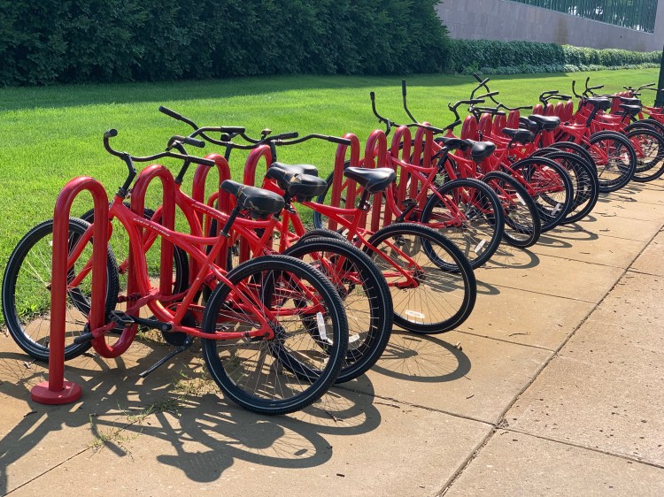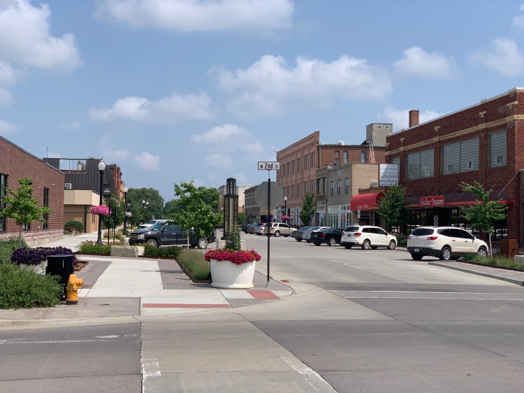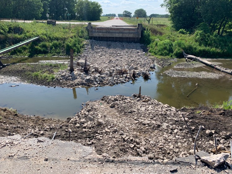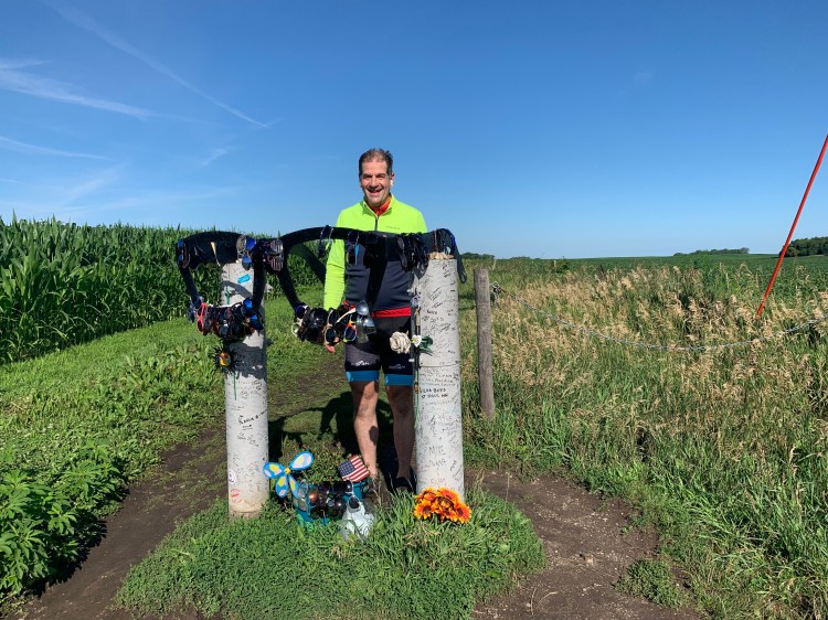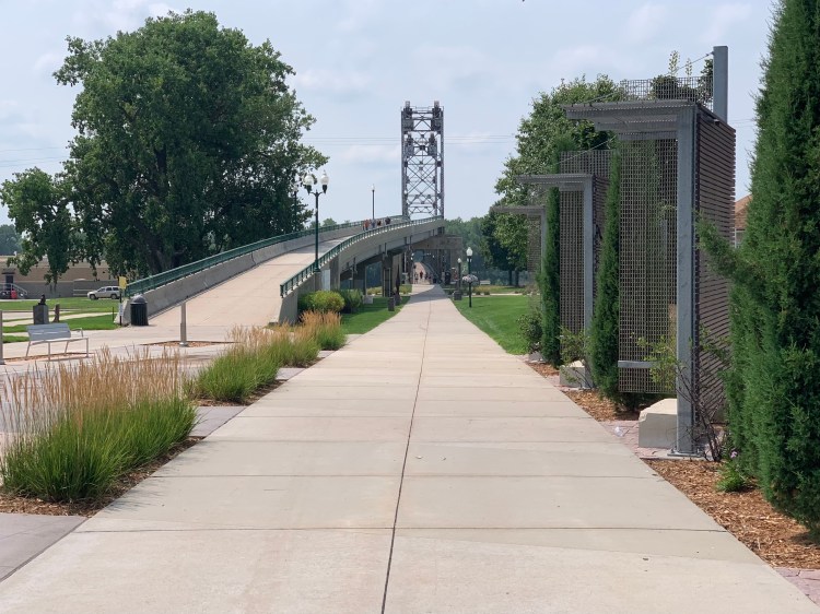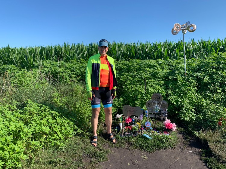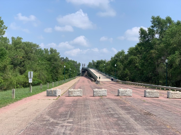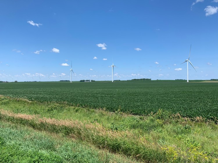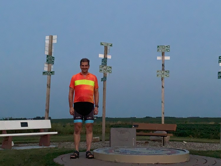 The climb back up the other side of the bluffs wasn’t as bad as the descent, otherwise it was just gentle rolling, with a hot tailwind. It got into the upper 80s, which is about as hot as I feel comfortable riding with a tailwind. A headwind, irksome though it is, is at least somewhat cooling. Tomorrow it’s going up to 94, so I will try to start early and get into a motel by the early afternoon. Yeah. We’ll see if that happens.