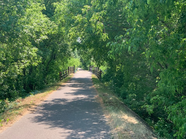 The headwind wasn’t too bad, the climbs were gradual, the scenery pleasant. One brief stretch of bike trail, otherwise unremarkable, had been renamed the Lake Wobegon Trail. I had to call my strong wife, and chat about our above average children. If only I was good looking…