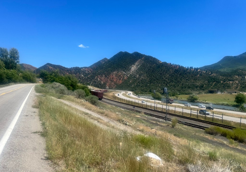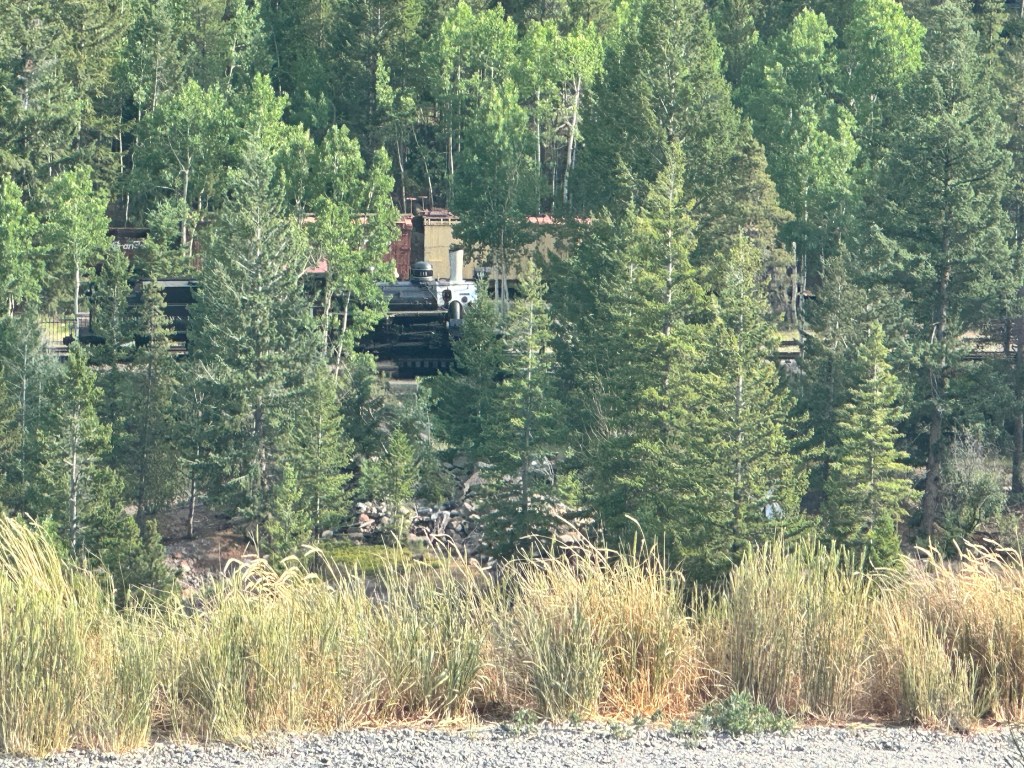 CW McCall’s song rang through my ears as I flew down the other side, glad I wasn’t carrying any chickens. Weird to feel the potential energy I’d stored up in the seven days of climbing since Glenwood Springs released as kinetic energy, miles and miles of endless downhill. Denver was almost 7,000 feet below. I rejoined I-70 just as it was emerging from the Eisenhower Tunnel. 15 years ago I’d had to ride on its shoulder, but now there was a bike path and I could relax and really enjoy the dazzling scenery. I was now following the boiling rapids of Clear Creek, a tributary of the South Platte. Georgetown was a historic mining town, and a restored steam engine was offering rides.