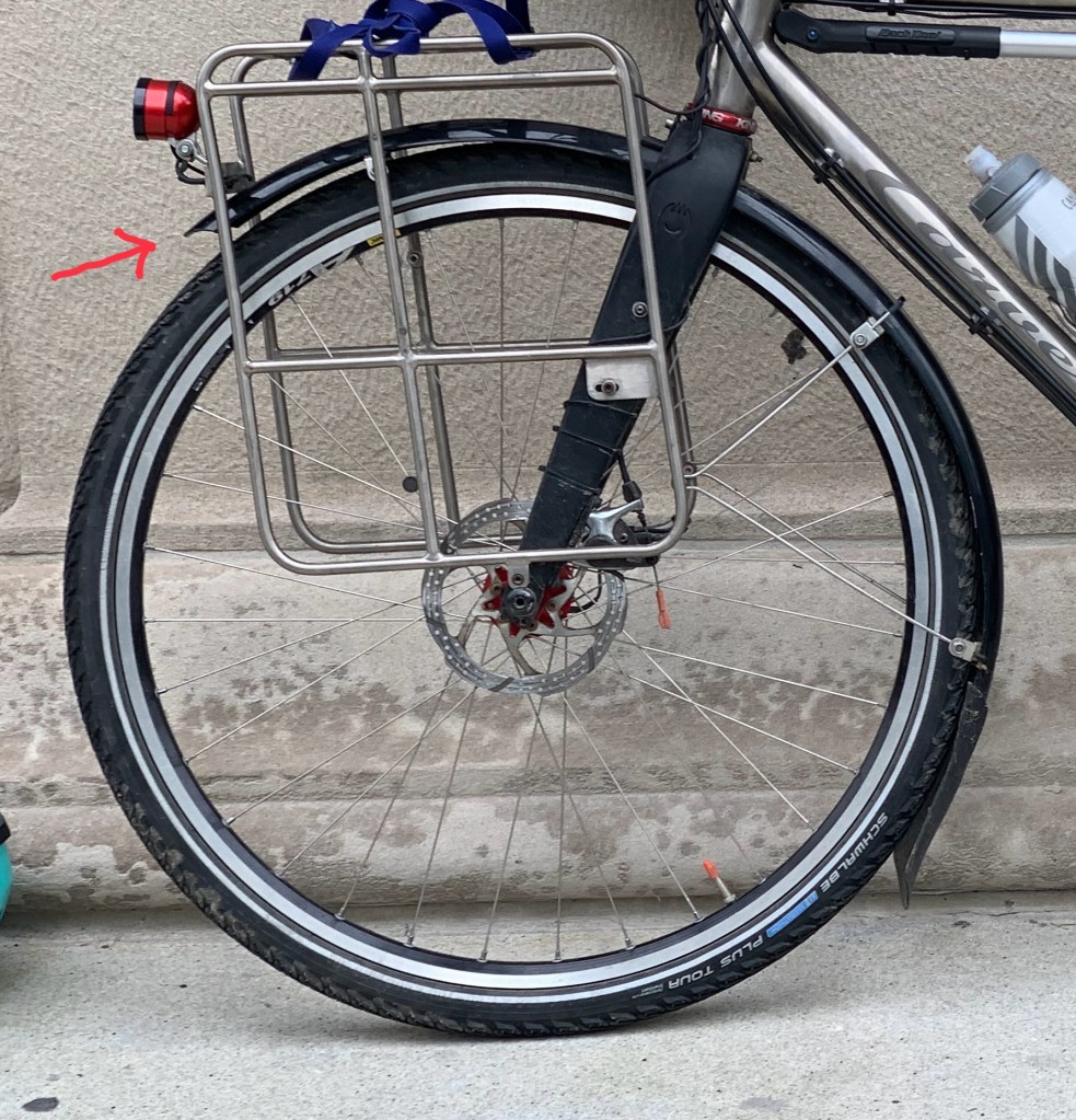 Fenders. We used to hate them: heavy, rusty, noisy, and ugly. The newer ones are plastic and quite light, make it big difference in the rain. No more black stripe up your back. If you’re going to get wet, better from the clean rain above than from the filthy grit kicking up from your wheels. I modified the front fender by trimming a second rear one, to give more coverage to my headlight. Planet Bike Cascadia, Wisconsin.