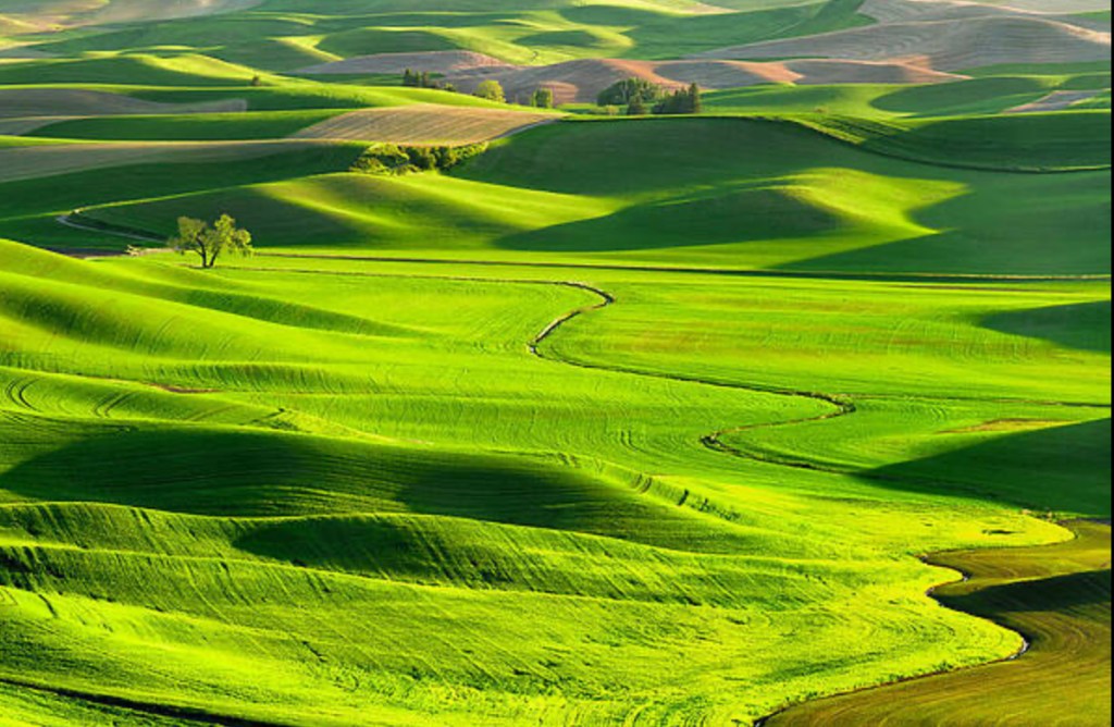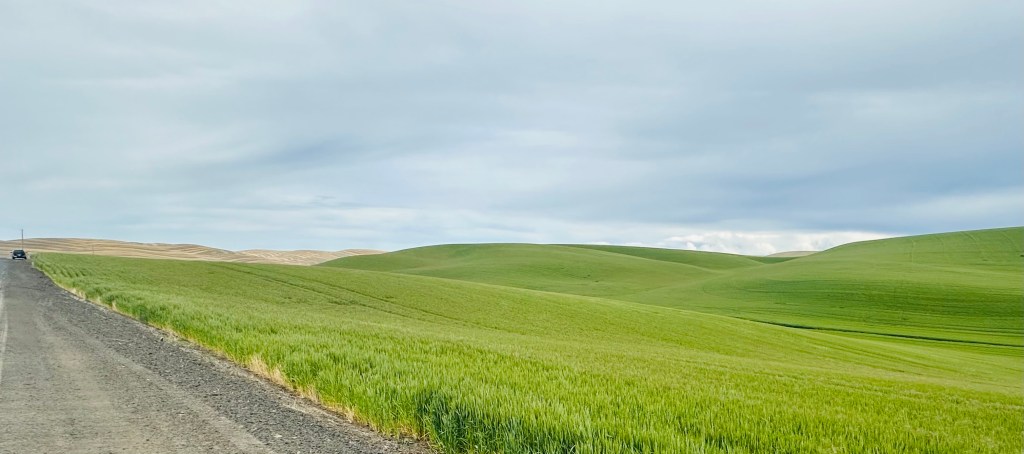 Stepbrother in-law Thom had told me of this place, a land of rolling hills covered in wheat, vivid green this time of year. They were made of loess, a predominantly silt-sized sediment that is formed by the accumulation of wind-blown dust (basically fertile sand dunes) like the Loess Hills on the border of Iowa and South Dakota I encountered on 7/15/21. Centered about 100 miles north of here, it extended as far down as Walla Walla. Some of you may remember it as the Windows XP wallpaper, called Bliss.