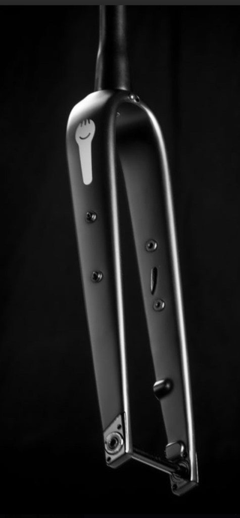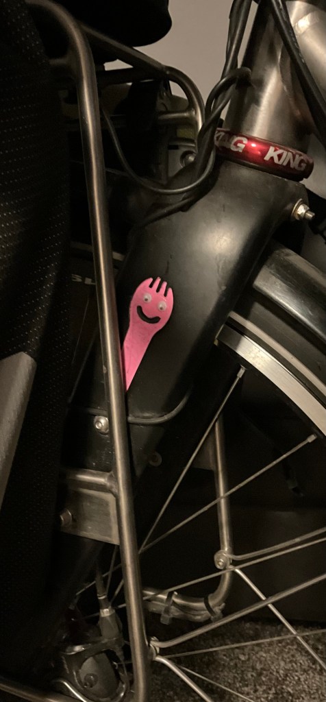 Fork. Titanium forks tend to be too flexible, so I chose a carbon fork, a Spork 2.0 by Rodeo Labs of Colorado. It has fender and rack mounts, and internal wiring from the generator. I added the googly eyes.