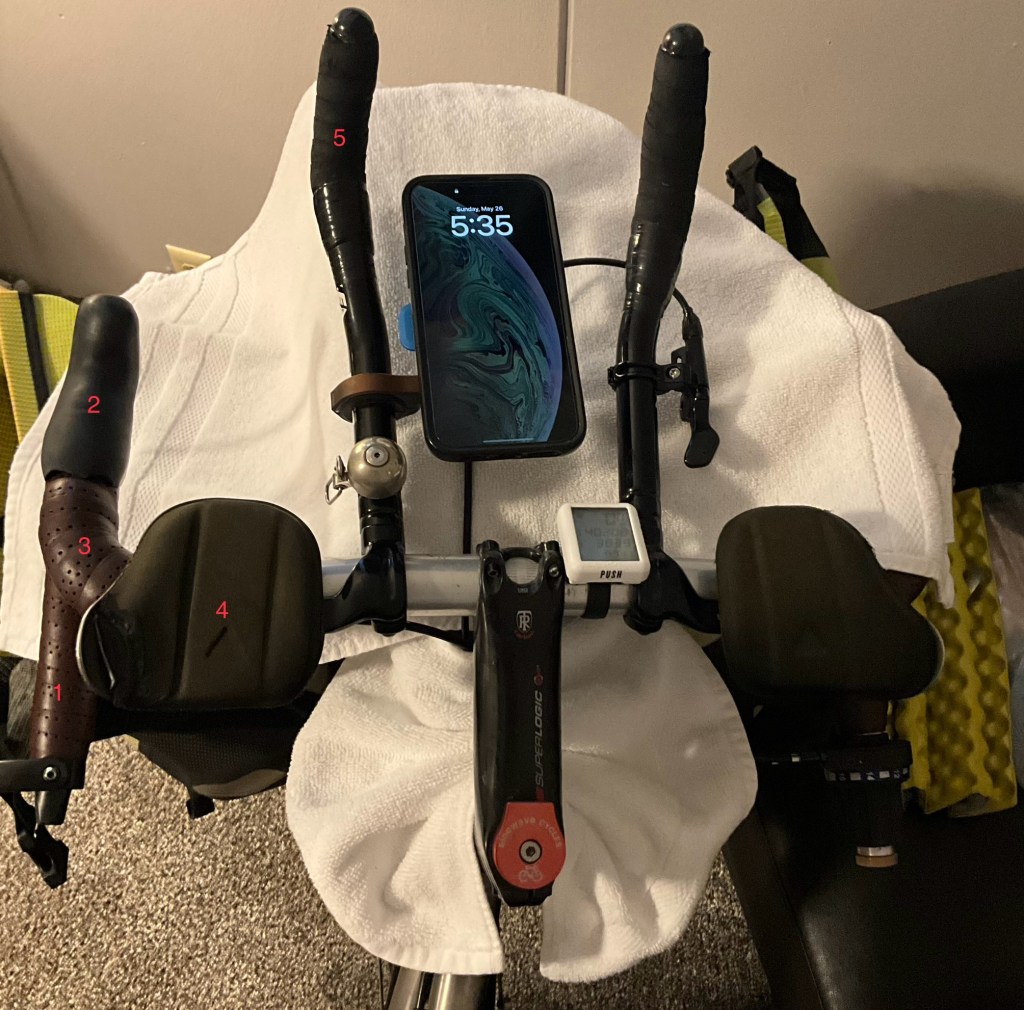 Aero bars, AKA bullet bars, let you get into a fuller tuck in headwinds, and give your hands a rest. Conversely, you can also rest your hands on top of the elbow pads for an even more upright position. They also provide additional mounting space for my bell, phone, and the control lever for the dropper post. Which brings up the big advantage of drop bars as opposed to flat handlebars. I have five different ways I can grip the handlebars (numbered in the photo, to grip at # 5, you rest your elbows at #4), and I use them all. It really helps on long rides. I’m mostly at position # 1, down in the drops. It took some getting used to, but once my body adapted, I found it much more comfortable.
