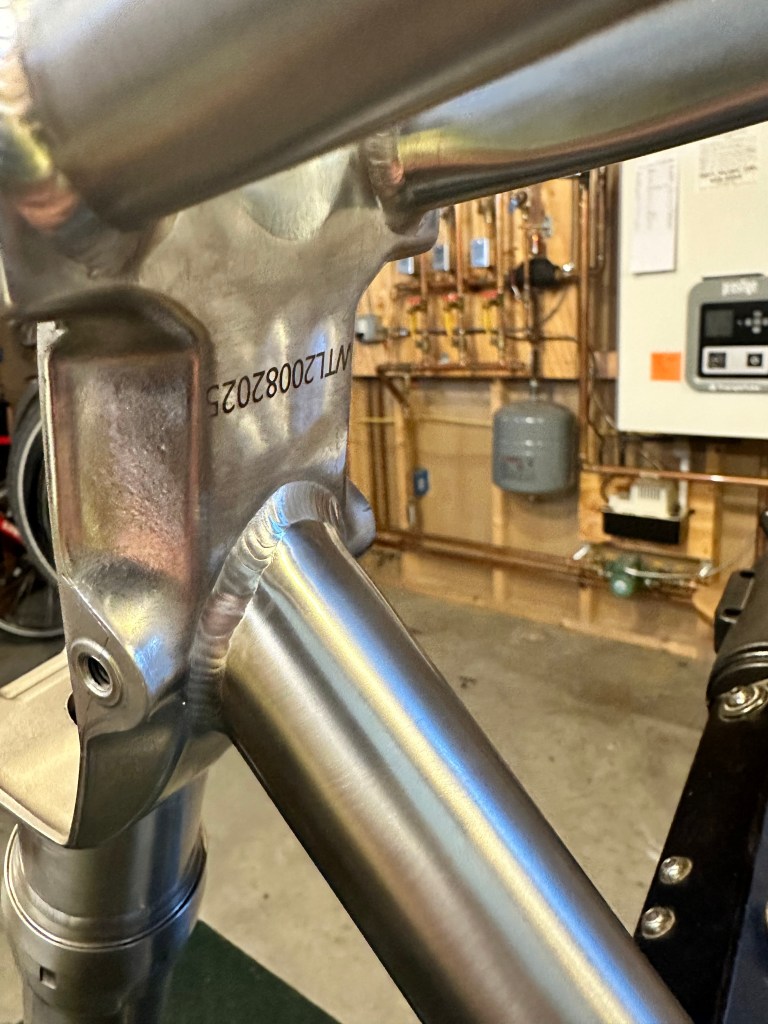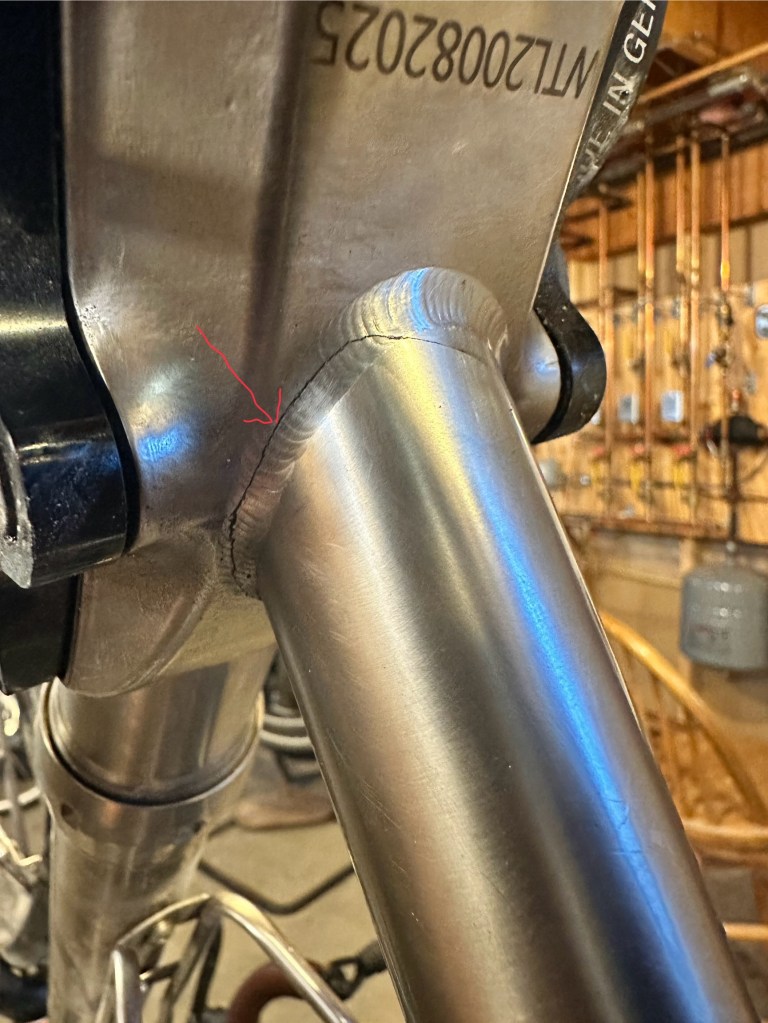 Titanium. Sounds exotic, but it’s actually the seventh most common metal on earth, titanium oxide is the chief ingredient in white paint. Purified, not only is it much stronger for its weight, but it has a resiliency, a combination of rigidity and shock absorption that rivals steel, much heavier. Aluminum is light too, but rock hard, riding over bumps is a real boneshaker. Titanium doesn’t rust, looks pristine after winters of road salt and summers of sweat exposure. You don’t need to paint it, if you like gunmetal gray (I had my logos etched in, so there’s no decals to chip or peel off). The other high-end frame material, carbon fiber, is glued together and can’t be repaired. Titanium is welded (has to be done in an inert gas atmosphere, one of the reasons why it’s so expensive); I had a crack appear after 4.5 years and 20,000 miles, it was repaired under warranty, check out these before-and-after pictures.