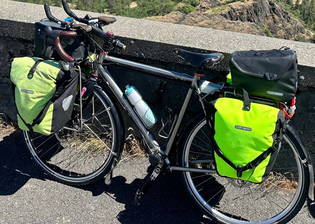 My panniers are all Ortlieb, all the time. Impregnated with Illuminite reflective threads, they kept everything dry in those days of constant Pacific Northwest rain.