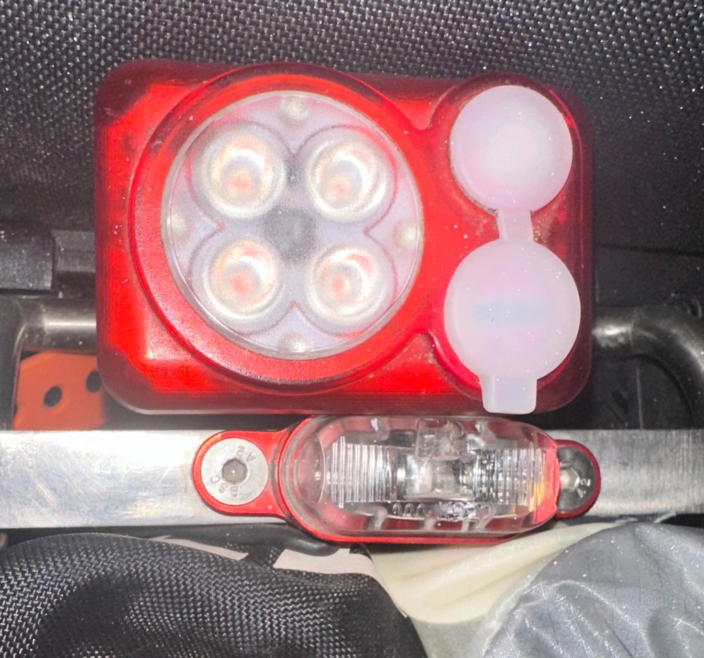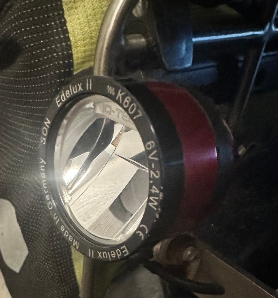Rear flasher. The Edelux generator taillight is quite bright, and suitable on its own for most occasions. In the city, and on sketchy roads, I turn on my DiNotte (New Hampshire, a charge lasts 6 hours at full power) quad red flasher, so bright it’s almost obnoxious, even in broad daylight. I remember one Saturday night, a drunk yelled out his car window, “Turn off da f_ckin’ lights!”