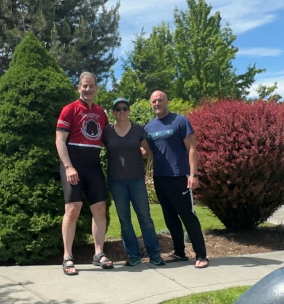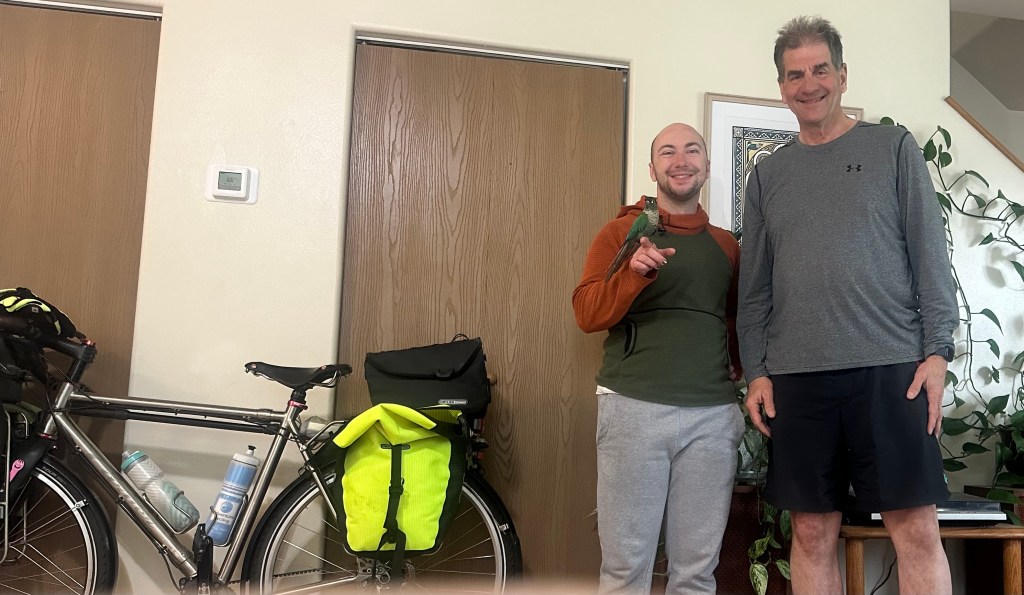 Low-key day today. Accommodation spacing, mountainous terrain, and Memorial Day weekend crowds have dictated that I take a trio of 30-mile days. Knowing this, I tarried with the Brannans, we had lots of fun sharing experiences, talking about our kids, careers, the airline industry, bike rides, contracting, and the whole Warmshowers experience. We shared jokes and videos, and could’ve talked for hours more. As it was, I didn’t leave till noon and got this farewell photo, unfortunately slightly blurry.