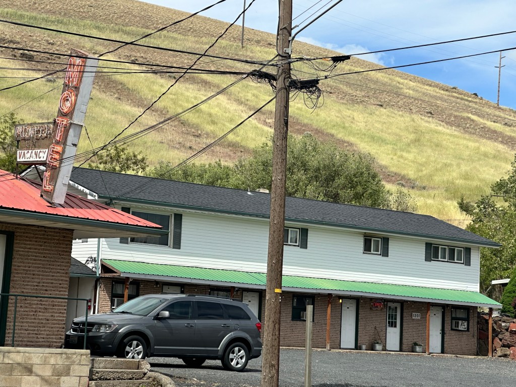 As you can see, mostly a tailwind, but sometimes a buffeting crosswind, that threatened to blow me right into traffic. The way it whipped around the Palouse hills reminded me of sailing regattas in the Charles River, surrounded by skyscrapers (at least there were no traffic helicopters hovering overhead). I had to keep an iron grip on the handlebars, and by the time I hit Pomeroy, I was pretty tapped out. As is common in this neck of the woods, there was nothing, nada, zippo, no place to stop for 37 miles. I thought maybe I’d go another 30 miles to Lewiston, but felt it best to stop here, even if the Pioneer Motel was creepy.