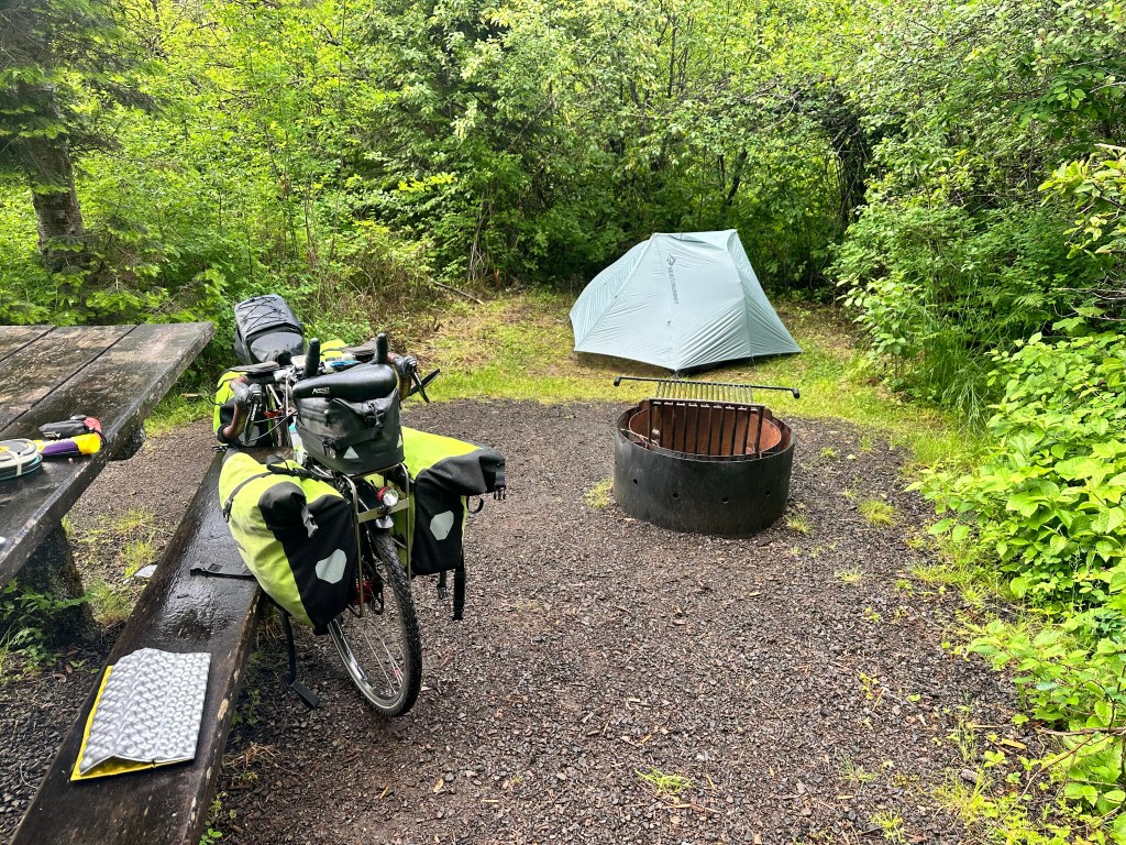 The rain paused just long enough for me to be able to set up my tent without getting the insides wet. Apparently there’s a way to set up the rain fly first, but I didn’t want to learn how to do it under these rushed circumstances. I used my camp stove for the first time to prepare Mountain House chicken pad Thai, it wasn’t half bad; Bonie had joked I was eating MREs, or K-rations. I hope to find kindred spirits in the campground, but the only people I encountered were drunken revelers from a wedding. Nothing to do but take a baby-wipes “shower”, go to bed early, and be thankful that this new tent is keeping me bone dry in the rain, and that my top quilts are keeping me warm at 40°. Nighty night.