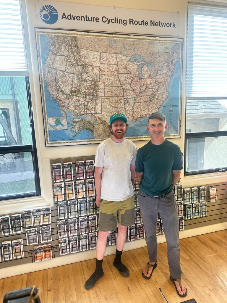 Inside were a cyclist’s lounge, with ice cream and cold drinks, lots of ACA memorabilia from the Bikecentennial glory days, a photo wall of all the cyclists who’d passed through, and Sam and Geoff, who knew more about cycling in these parts than anyone.
