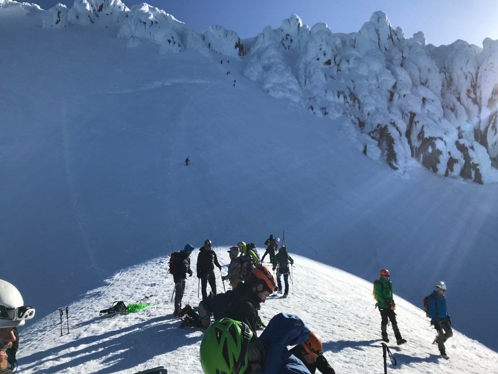 Like on Rainier, they want you at the summit at 7:30 AM. Snowcats leave at 2 and 3 AM and when they drop you off, you rope up to your guide, with helmets, ice axes, and crampons, and start climbing.