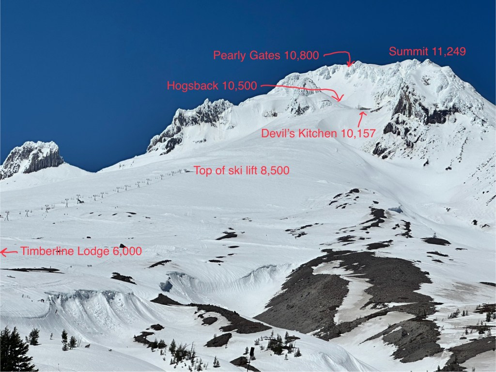 And here we are at the Hogsback, five hours later. A grinding uphill slog, uneventful but slow. We had just passed the Devil’s Kitchen, a sulfurous vent that reminded us Hood, like most of the Cascades, is a semi-dormant volcano. I felt tired but OK, but Brad recommended turning around. We only had 700 feet left to climb, but that included the treacherous Pearly Gates, a chute where most of the fatalities occur. You can see it at the top center, with climbers (mostly boyz, of course) strung along a rope.