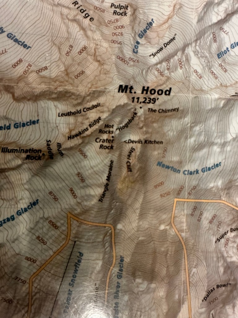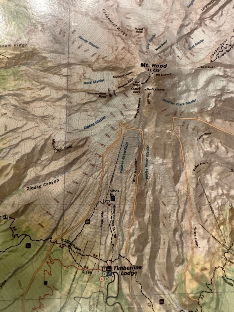 Today was Sunday, a day of rest, I took my time checking out of the Government Camp motel, chatted, web surfed, wished Jane a happy Mother’s Day, drove the 7 miles to Timberline Lodge, and waited around for early check-in to my room at 2 PM. Retrieved the big box from Jane, sorted out my gear, and didn’t really get going until four. In the lobby was a detailed contour map, you can zoom in if you like.